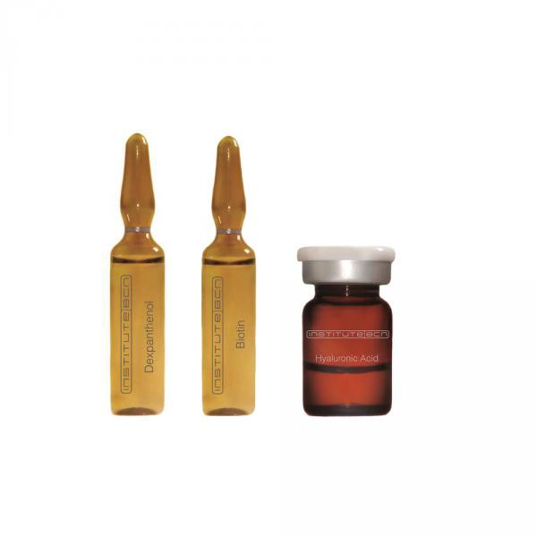 Bőrünk törékeny biokémiai egyensúlyának megtartásában fontos szerepet tölt be a víz és a bőr megfelelő nedvességtartalma. A legkisebb alulhidratáltságra is külső takarónk ráncokkal, rugalmasság vesztéssel és a korneociták gyorsabb leválásával válaszol. Az Institute BCN nedvességpótló koktéljával minden olyan hatóanyaghoz hozzájuthatsz, mellyel a bőrben lévő vizet megkötheted. A szett legfőbb hatóanyaga a 2%-os hialuronsav, mely saját súlyának akár ezerszeresét is képes nedvesség formájában megkötni. Ugyanakkor töltőanyaga is az irhában található kötőszöveti rost állománynak, mellyel a bőr feszesítéséhez is hozzájárul. A bőrön keresztül történő vízvesztés lassítását a Dexpanthenol ampullával érhetjük el, mely szintén kiváló vízmegkötő, de a bőr regenerációjában a kialakult gyulladások csökkentésében is szerepet játszik. Az előző két hatóanyag hatását pedig szinergens módon egészíti ki a Biotin, azaz a H-Vitamin, mely új bőrsejtek képzése révén, valamint a szövetek frissen tartásával megfelelő közeget teremt a Hialuronsav és Dexpanthenol hidratáló hatásához.