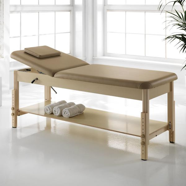 Feng Shui masszázságy bézs színben, masszív fa vázzal. Állítható lábakkal és háttámlával rendelkezik ez a masszázs ágy. A fekvőrész alatt egy nagy polc került kialakításra, itt tudod tárolni a masszázshoz szükséges eszközöket.
