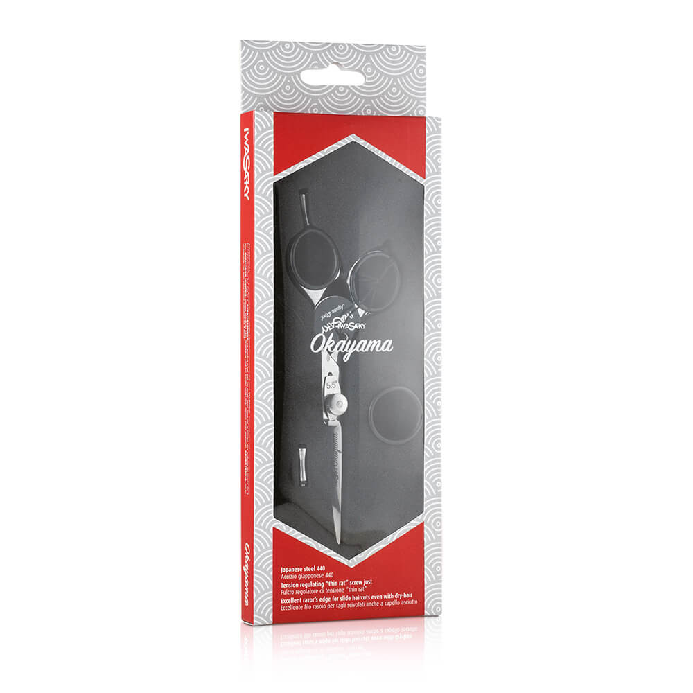 Iwasaki Okayama fodrászolló. Nagy keménységű japán 440 acélból készül. Speciális beállító csavarral, ami a vágás erősségét segít szabályozni. Ujjtámasszal rendelkezik a kényelmesebb használat érdekében. Kiváló hajnyírást biztosít még száraz hajon is.