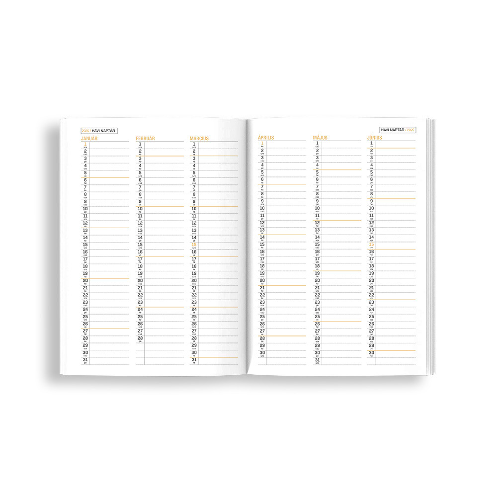 Tervezd meg munkanapjaidat egy igazán praktikus határidőnaplóban! Könyvkötött, keményfedeles, félórás beosztásokkal kiegészített naptár, amiben tökéletesen megtervezheted munkaheteidet!