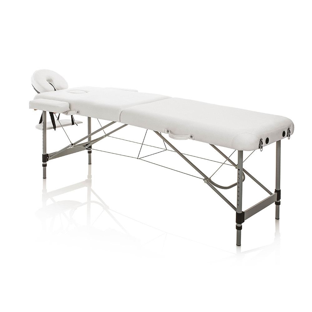 Master Alluminium masszázságy fehér színben, masszív alumínium vázzal. Állítható lábakkal rendelkezik ez a masszázs ágy. Összecsukható kivitel, nagy teherbírással. Ultrakönnyű súly, a könnyű hordozhatóságért. A hordtáska és a karfák mind tartozékai ennek a masszázságynak.