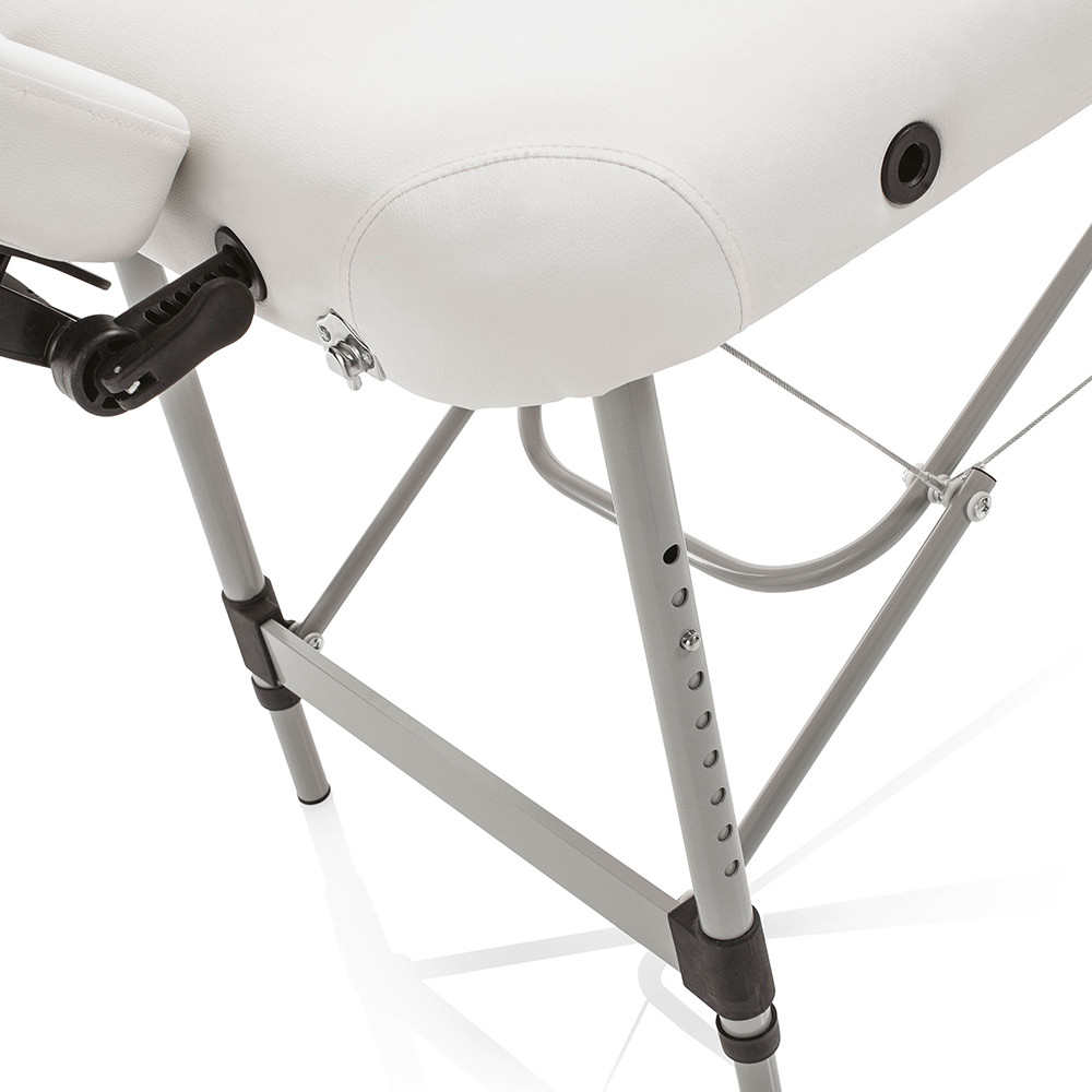 Master Alluminium masszázságy fehér színben, masszív alumínium vázzal. Állítható lábakkal rendelkezik ez a masszázs ágy. Összecsukható kivitel, nagy teherbírással. Ultrakönnyű súly, a könnyű hordozhatóságért. A hordtáska és a karfák mind tartozékai ennek a masszázságynak.