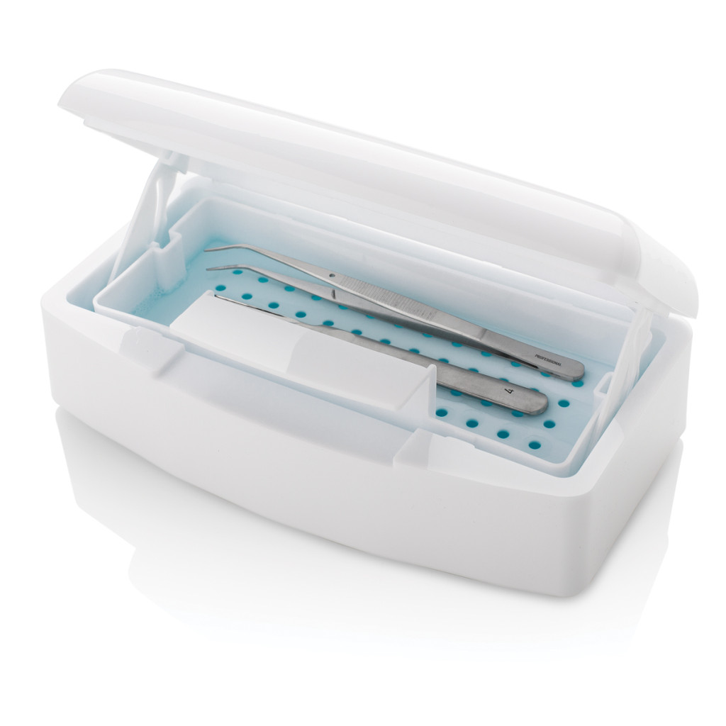 Mini eszközfertőtlenítő, fehér színben. Az eszközfertőtlenítő jó minőségű műanyagból készült, lecsukható tetővel és kivehető tálcával rendelkezik.