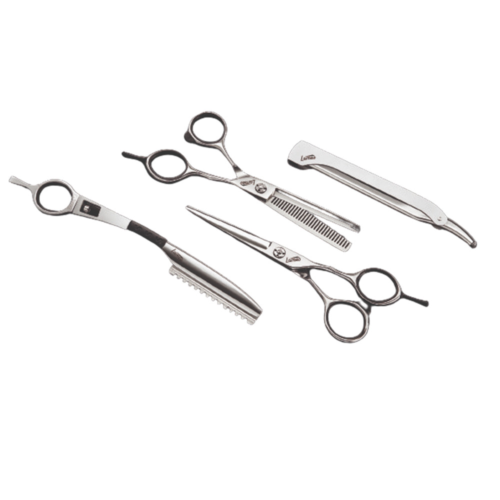 A készlet kétféle, ollót tartalmaz. Az egyik egy professzionális sima pengéjű fodrászolló. A másik egy ritkítóolló, amely fogazott pengével rendelkezik és a haj árnyalására vagy ritkítására szolgál.