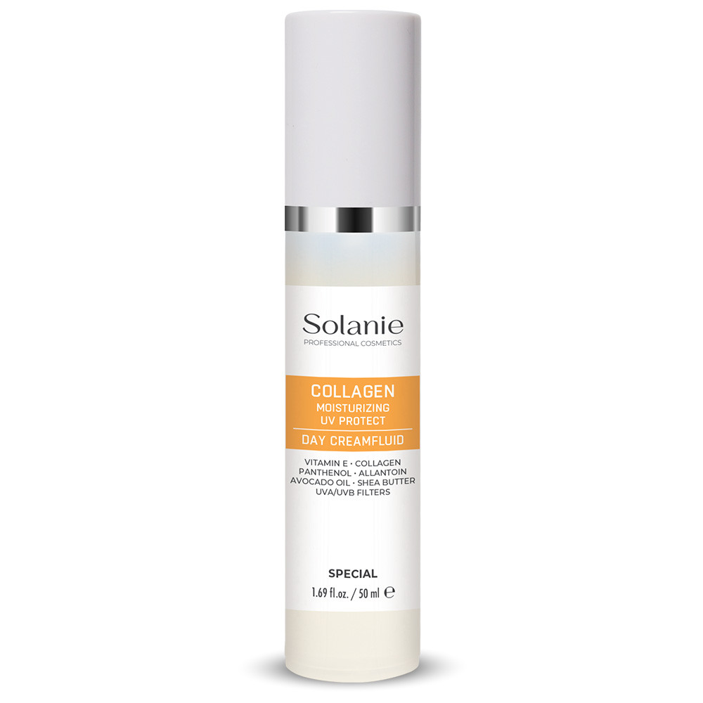 A Solanie kollagénes krémfluidjánál keresve sem találhatnál jobbat bőröd nappali és azonnali ápolásához. A kollagénnel, UV-A, UV-B filterekkel, E-vitaminnal dúsított ápoló mindazt megadja bőrödnek, amire a szabad levegőn tartózkodáshoz és szépségének megőrzéséhez szükséges. Észrevétlenül a bőrt nem terhelve. A benne található UV szűrőkkel védi bőröd a napfény okozta bőröregedsétől, így bátran viselheted napközben a szabad levegőn. Kollagén hatóanyaga segít rugalmasan tartani a bőröd feszességéért felelős rugalmas rostokat, hogy az hosszú ideig megőrízze fiatalos szépségét. Hozzáadott E-vitamin összetevője az egyik legerősebb antioxidáns mely gátolja a szabadgyökök képződését és minimalizálja a bőrsejteket érő oxidatív stresszt. Sheavaj és avokádóolaj komponensei táláló és rugalmasító hatásúak, ugyanakkor finom védőrétegként vonják be a bőrt meggátolva a nem kívánatos vízvesztést.