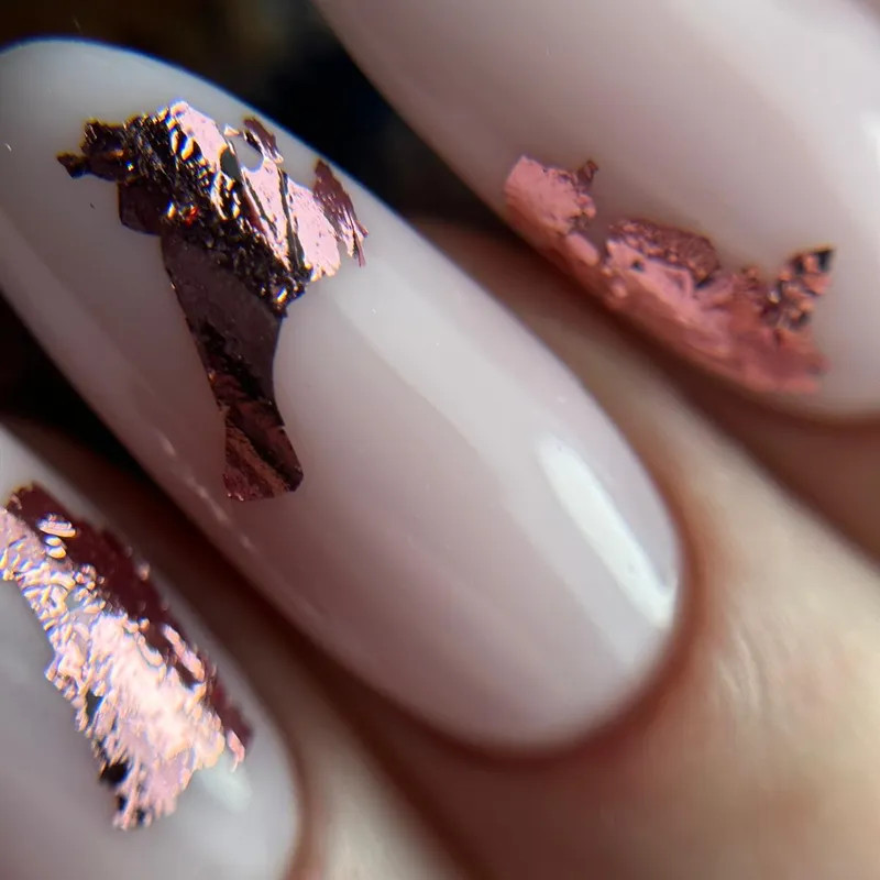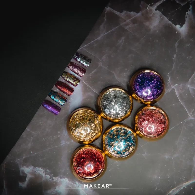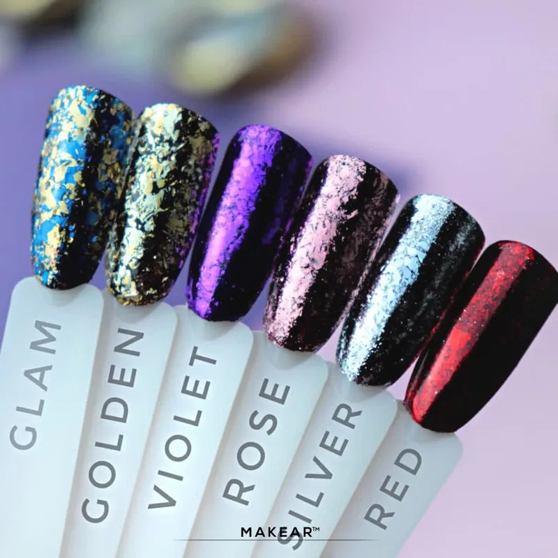 Használata: A pelyheket szabálytalanul simítsa fel az alap, a fedő vagy a szín ragacsos rétegére, majd vigye fel a végleges fedő réteget.